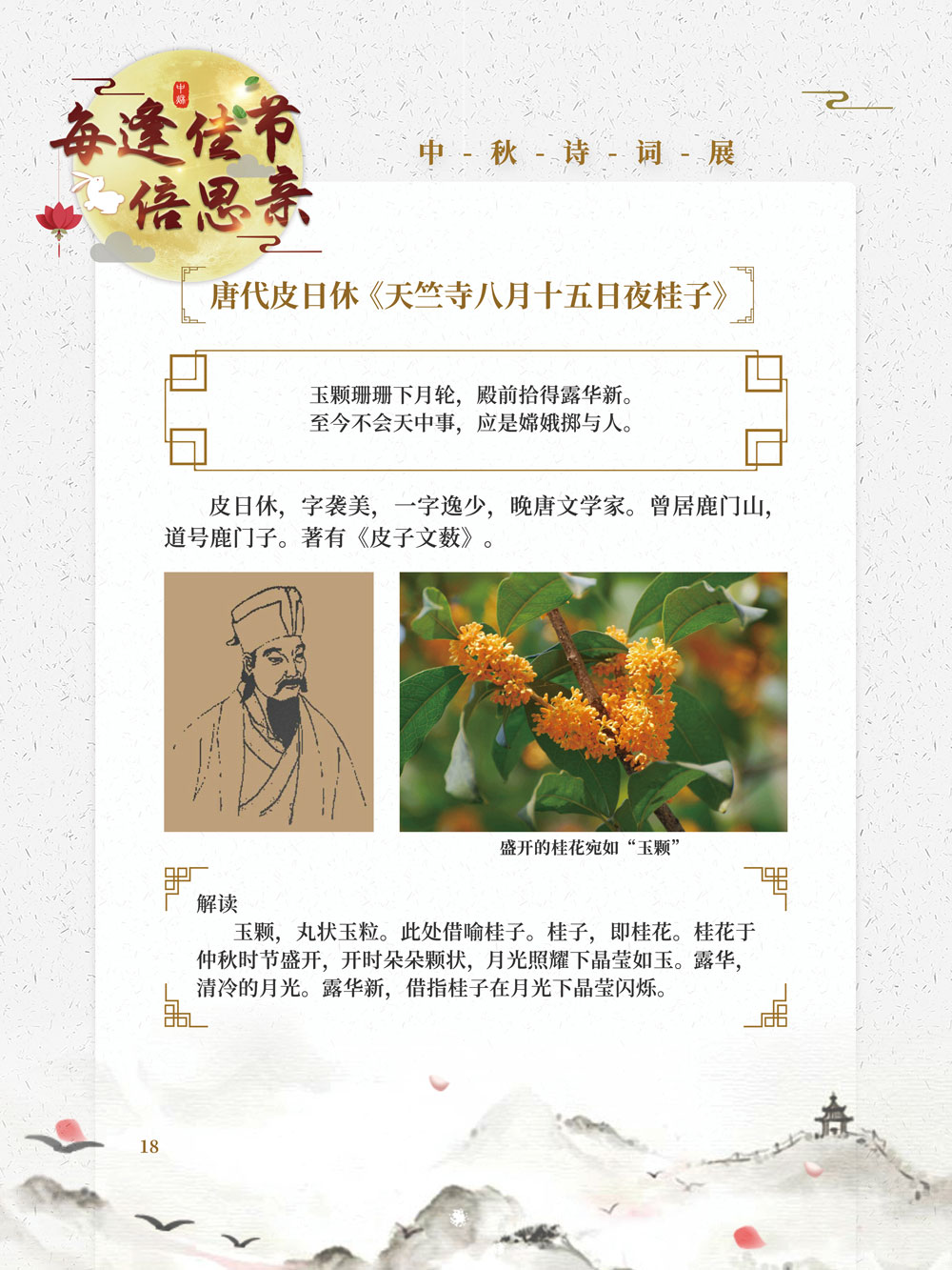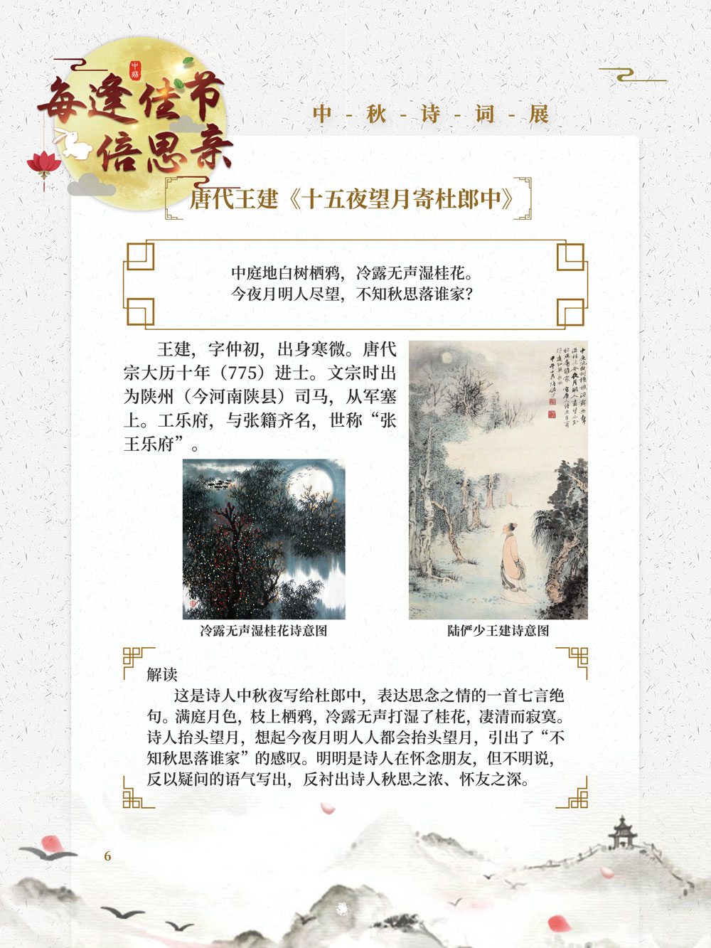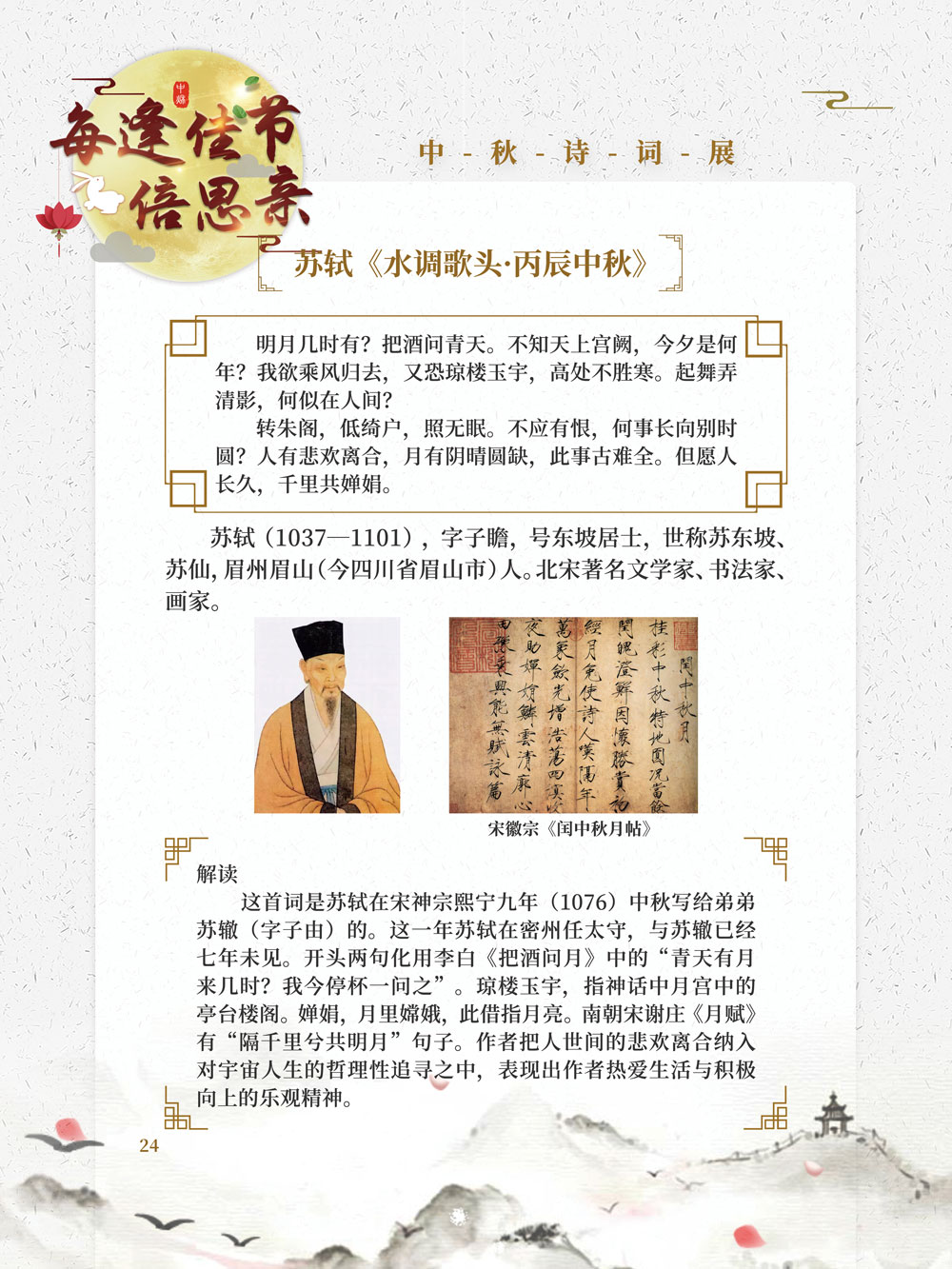 本展览所选的四十余首中秋古诗词,其整体风貌多表达个人的愁思与对人情事理的哲理思考,但都落脚于对团圆、安宁的幸福生活的期望,以及对人类美好生存环境的祈盼,充分表现了中秋佳节家国团圆的内涵,读者可以细细品味。