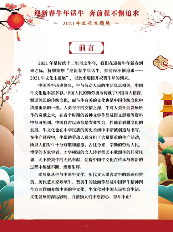 2021年是传统十二生肖之牛年,我们在迎接牛年新春到来之际,特策划了“迎新春牛年话牛,奔前程不懈追求——2021牛文化主题展”以此来迎接并祝贺牛年的到来。