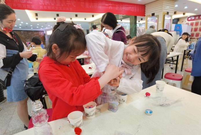 活动中,老师带领小读者们认识所需的手工材料,教他们用五彩的小水弹珠、各种小贝壳、小珍珠,还有多彩的会发光的夜光珠一层一层地放到小熊形状的透明瓶子中进行装饰。在老师的指导下,孩子们认真参与其中,选工具,添材料,充分发挥自己的想象力和创造力,创作自己独一无二的小熊彩虹瓶,忙得不亦乐乎。不一会儿,每一位孩子都制作出了自己心仪的“瓶中的彩虹”。